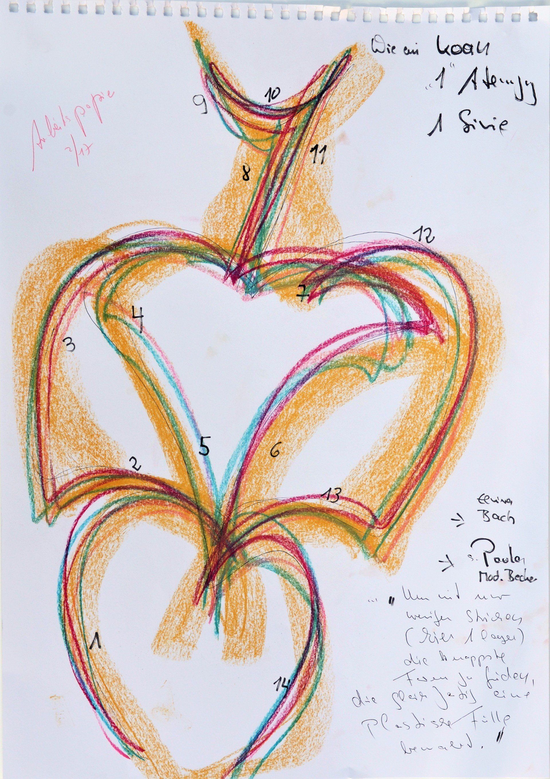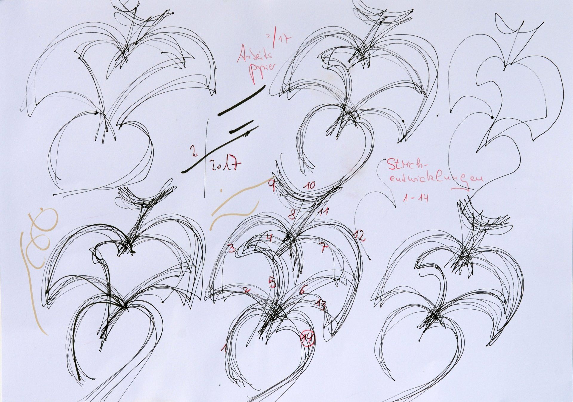 Die Zeichnungen, die den Skulpturen „König“ und „Königin“ zugrunde liegen sind in einem längeren Prozess entstanden. Sie entstanden aus einer einzigen Linie, konzentriert und schnell, in einem Atemzug, meditativ. Der Laser zeichnet dann diese Linien in den Stahl – die Linie verlässt das Papier.
